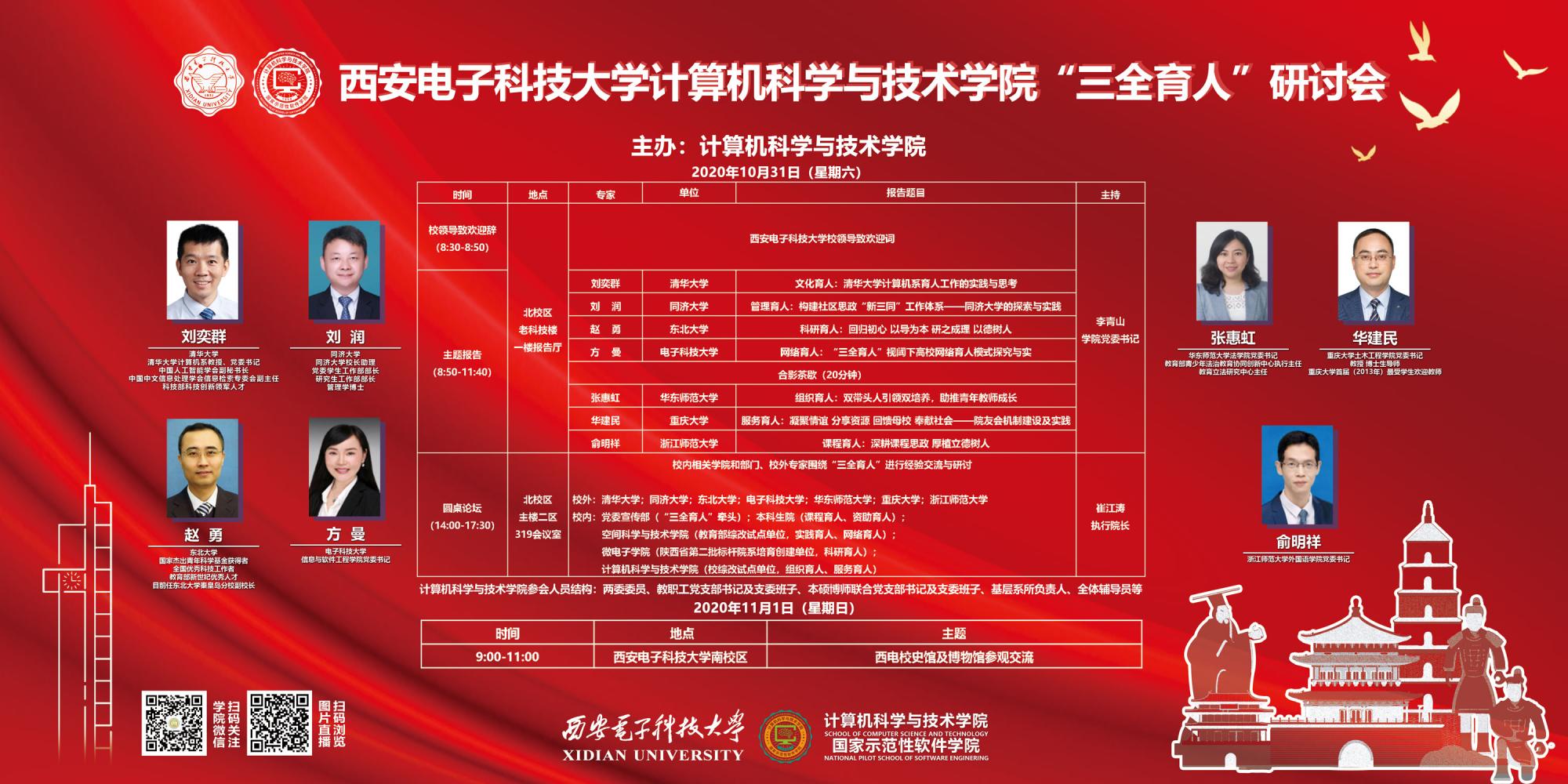(通讯员 同榛)为认真贯彻全国高校思想政治工作会议和全国教育工作大会精神,研讨高校思想政治教育质量工程,推进学院“三全育人”综合改革试点工作,提升人才培养质量,bat365在线中国登录入口作为学校首批“三全育人”综合改革试点学院,于2020年10月30日至11月1日在北校区举办“三全育人研讨会”。此次研讨会由bat365在线中国登录入口主办,邀请清华大学、同济大学、东北大学、电子科技大学、华东师范大学、重庆大学、浙江师范大学等7所高校专家,党委宣传部、本科生院、研究生院等校内相关部门和微电子学院、空间科学与技术学院等单位相关负责人,采取主题报告和圆桌论坛的形式,围绕落实落细“十大育人体系”进行深入研讨和广泛交流。学院党政班子、两委委员、教职工支部书记和支委班子、本硕博师联合支部书记和支委班子、辅导员等共计150余人参与了此次研讨会。校党委副书记杨银堂出席研讨会并致欢迎辞。