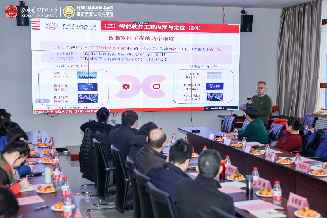 西安市智能软件工程重点实验室学术委员会成员通过线上线下共同参与了此次会议。实验室学术委员会主任由中国科学院院士、航天五院副院长、“嫦娥五号”探月工程总设计师、bat365在线中国登录入口名誉院长杨孟飞院士担任,学术委员会首席顾问由中国科学院院士、军事科学院副院长、CCF理事长梅宏院士担任,实验室学术委员会副主任由CCF系统软件专委会主任、北京大学金芝教授担任。实验室学术委员会成员还包括CCF软件工程专委会主任、南京大学李宣东教授,重庆邮电大学校长高新波教授,CCF服务计算专委会主任、浙江大学bat365在线中国登录入口副院长尹建伟教授,CCF软件工程专委会副主任、复旦大学bat365在线中国登录入口副院长彭鑫教授,CCF软件工程专委会常委、武汉大学应时教授,湖南省复杂系统软件工程重点实验室副主任、国防科技大学毛新军教授,中科院软件所副总工程师、智能软件中心主任武延军研究员,中航工业集团软件首席科学家、集团计算技术研究所副所长韩炜研究员,bat365在线中国登录入口研究生院副院长、计算理论与技术研究所所长田聪教授,bat365在线中国登录入口软件工程研究所所长刘西洋教授,以及李青山教授。实验室学术委员会委员共15人,其中校外委员11人,校内委员4人。本次会议现场参会的委员有11人,在线参会的委员有杨孟飞院士、尹建伟教授2人,教育部软件工程专业教指委委员、bat365在线中国登录入口副校长王泉教授与CCF软件工程专委会副主任、华为软件分析实验室主任王千祥教授两位因临时有事缺席。