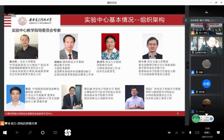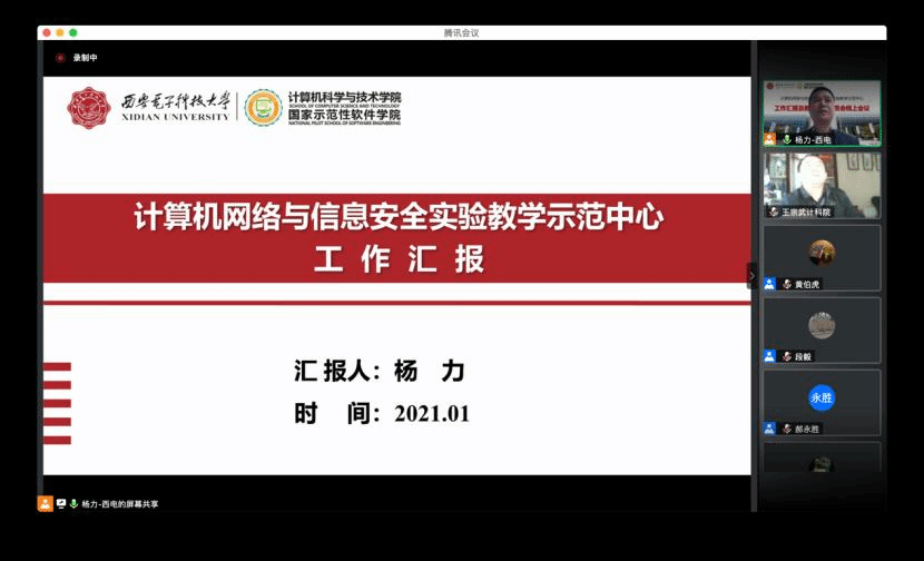 (通讯员 段毅 黄伯虎)1月27日上午,计算机网络与信息安全国家级实验教学示范中心通过腾讯会议举行了“工作汇报及教学指导委员会线上会议”。参加此次会议的教学指导委员会专家有:北京大学郝永胜教授、陕西师范大学傅钢善教授、西北大学耿国华教授、西安交通大学桂小林教授、中国高校创新创业孵化器联盟理事长蔡震、bat365在线中国登录入口崔江涛教授和苗启广教授。学校及学院参会代表有:学校实验室与设备处副处长(主持工作)韩卿、学院教学副院长万波,实验示范中心主任杨力、副主任贾文、王宗武、黄伯虎、张跃宇及实验示范中心教师等30余人。本次会议由杨力主任和郝永胜教授共同主持。
