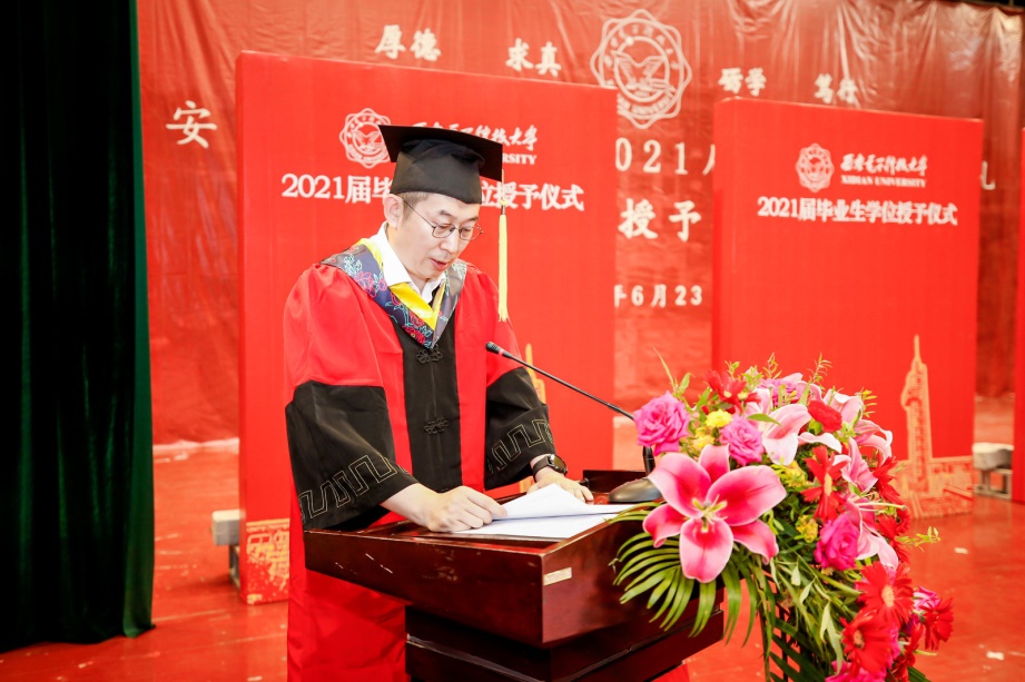 学院副院长万波教授宣读学校授位决定,2021届共937名本科毕业生,包括2名来华留学生,获得学士学位。