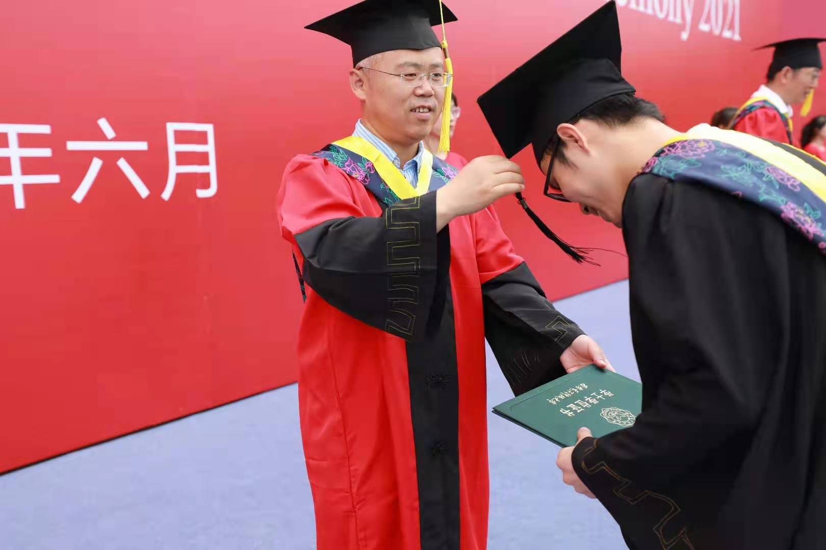 副校长王泉教授百忙之中出席学院授位仪式并为毕业生授位。同学们依次上台,向授位导师鞠躬致敬。王泉副校长与学院李青山、崔江涛、沈玉龙、宋胜利教授共同为同学们一一拨穗授位,并合影留念。