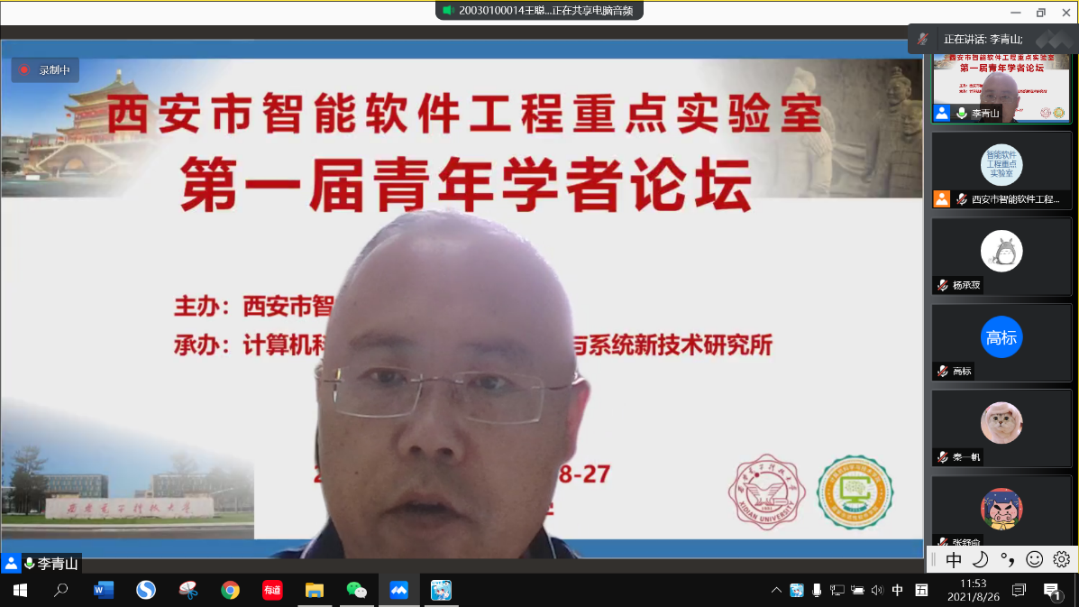 论坛开幕式由bat365在线中国登录入口软件工程学科负责人、bat365在线中国登录入口党委书记、西安市智能软件工程重点实验室主任李青山教授致辞。李青山简要介绍了本次论坛的情况,对各位报告嘉宾和在线听众表示热烈欢迎,并从两个方面强调了本次青年论坛预期达到的目标。一方面借助论坛,围绕智能软件与智能系统相关问题与进展,进行广泛的学术交流与研讨,让西电以及国内相关领域师生在学术研究、自身发展等方面有收获、有进步。另一方面,通过论坛加强不同学校间相关领域青年教师的交流与学术互动,为领域内青年教师的成长提供一个良好的平台。