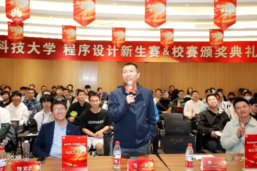 华为技术有限公司赞助了本届程序设计竞赛以及2022程序设计新生赛,2023年5月7日为本届校赛及78名新生赛获奖同学举行了颁奖会,我校创新创业学院副院长尹鹏、bat365在线中国登录入口副院长暨程序设计竞赛基地主任万波教授出席颁奖会并作了发言,华为光产品线代表刘文杰、雷俭、陈晓磊、陈泽等介绍了算法在光产业业务中的应用,就ICPC人才发展与培养等问题与同学们进行了充分交流。