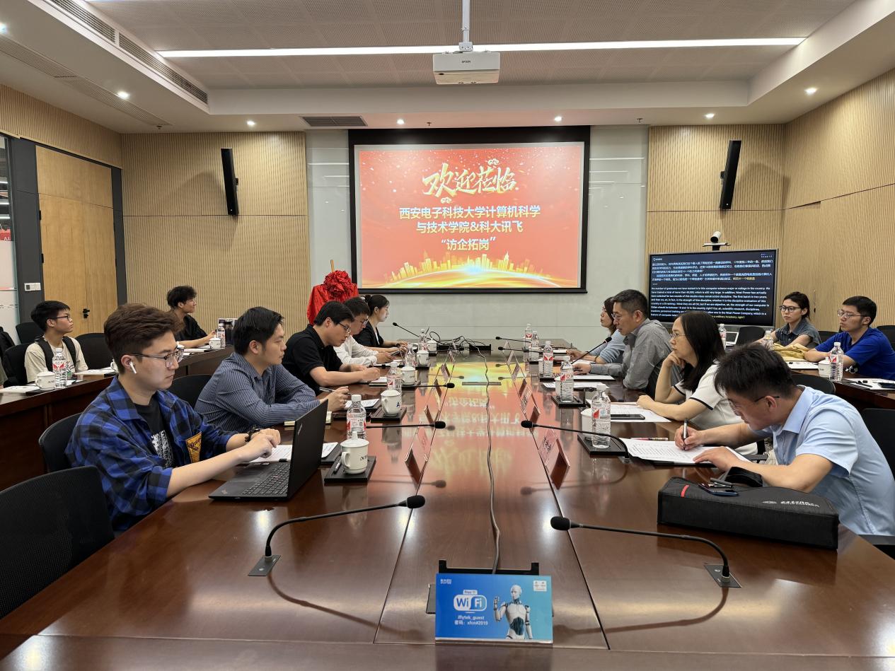 参观结束后,双方就深化校企合作,协同加强科研攻关、智能教育、就业育人等进行座谈交流。科大讯飞西安研究院副院长来意哲对bat365在线中国登录入口师生一行的到访交流表示热烈的欢迎。崔江涛就学院历史沿革、专业设置、学科建设、科研师资、人才培养优势等方面做了简要介绍。他表示,科大讯飞作为高校科研成果转化的企业典范,在人工智能和计算机领域都有着卓越的成绩和贡献。学院高度重视产学研融合发展,一直持续深化与对口企业的科研联合攻关,希望下一步与科大讯飞在重大科研项目、创新人才培养等方面建立深度合作。双方还就下一步开展在AI+教育领域的合作进行了深入交流。
