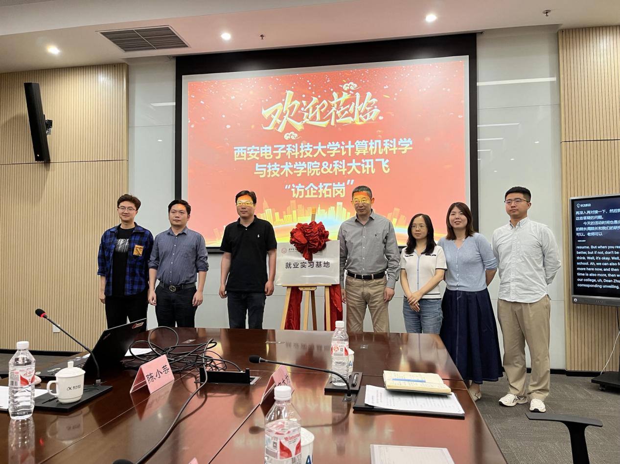 随后,科大讯飞高教行业对接、人力资源招聘相关负责人分别就讯飞产品生态和校园招聘、人才引进政策等方面做了详细介绍。就职于科大讯飞、学院2023届硕士毕业生齐海博分享了自己的求职心路历程和职场角色转化经验,并和研究生代表进行了现场交流。会议最后,崔江涛和来意哲代表双方共同为“就业实习基地”揭牌。