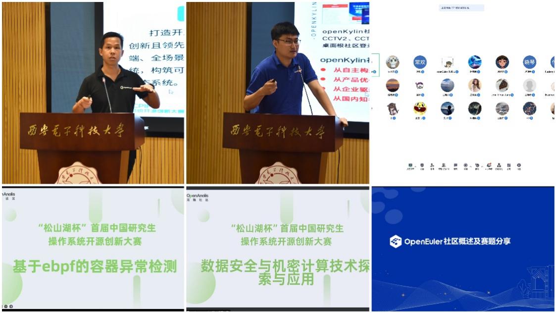 董金光、李卓珩、朱云成分别介绍了OpenHarmony赛题、OpenKylin赛题、OpenEuler赛题,程书意围绕《基于eBPF的容器异常检测》进行了赛题技术解析,麻付强以《数据安全与机密计算技术探索与应用》为题进行了分享。他们就赛题解析、开发实践等相关方面给同学们进行了介绍,鼓励学生积极参赛,以开源的形式,凝聚更多开发者和生态合作伙伴的力量,为基础软件研发不断注入“人才活水”。