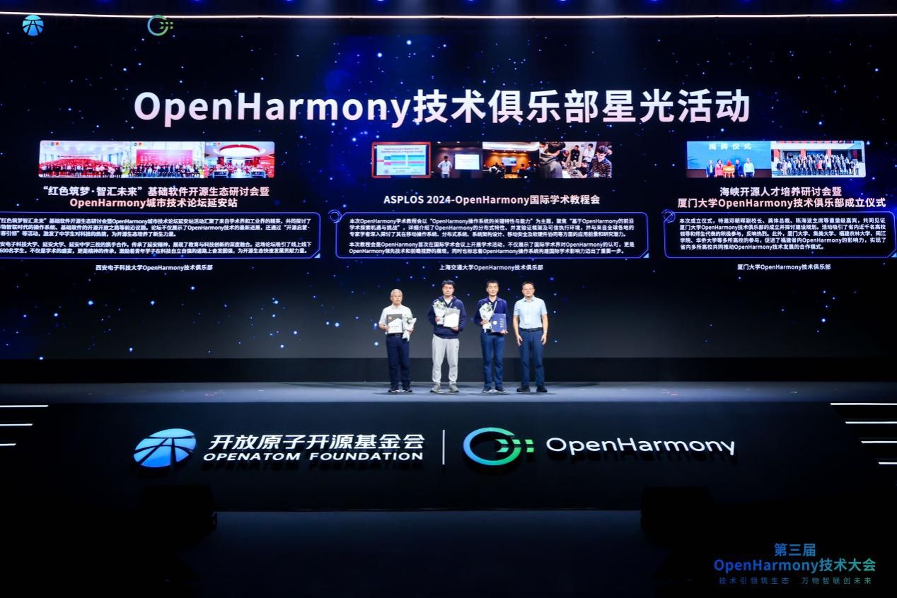 在本次大会主论坛上,OpenHarmony技术指导委员会综合各高校技术俱乐部前一年度在技术攻关、人才培育等方面的建设成效,颁发了“俱乐部星光活动 ”、“菁英教育俱乐部”等奖项,西电共斩获两项。其中,今年5月由bat365在线中国登录入口(示范性软件学院)发起,共青团bat365在线中国登录入口委员会指导和参与下共同开展的 “红色筑梦·智汇未来”基础软件开源生态研讨会暨OpenHarmony城市技术论坛延安站获评“OpenHarmony技术俱乐部星光活动”(共3个),李青山教授代表bat365在线中国登录入口上台领奖;bat365在线中国登录入口OpenHarmony技术俱乐部获评“菁英教育OpenHarmony技术俱乐部”(共5个),俱乐部副主任张宁老师上台领奖。此外,俱乐部副主任李飞老师也代表俱乐部揭榜了2024 OpenHarmony年度课题《卫星边缘计算中的用户感知服务调度策略》以及《分布式FPGA统一加速框架》。