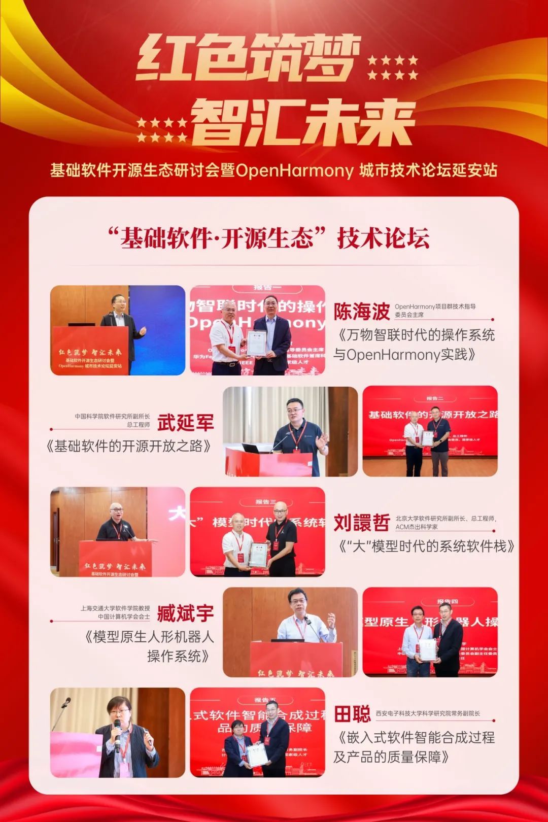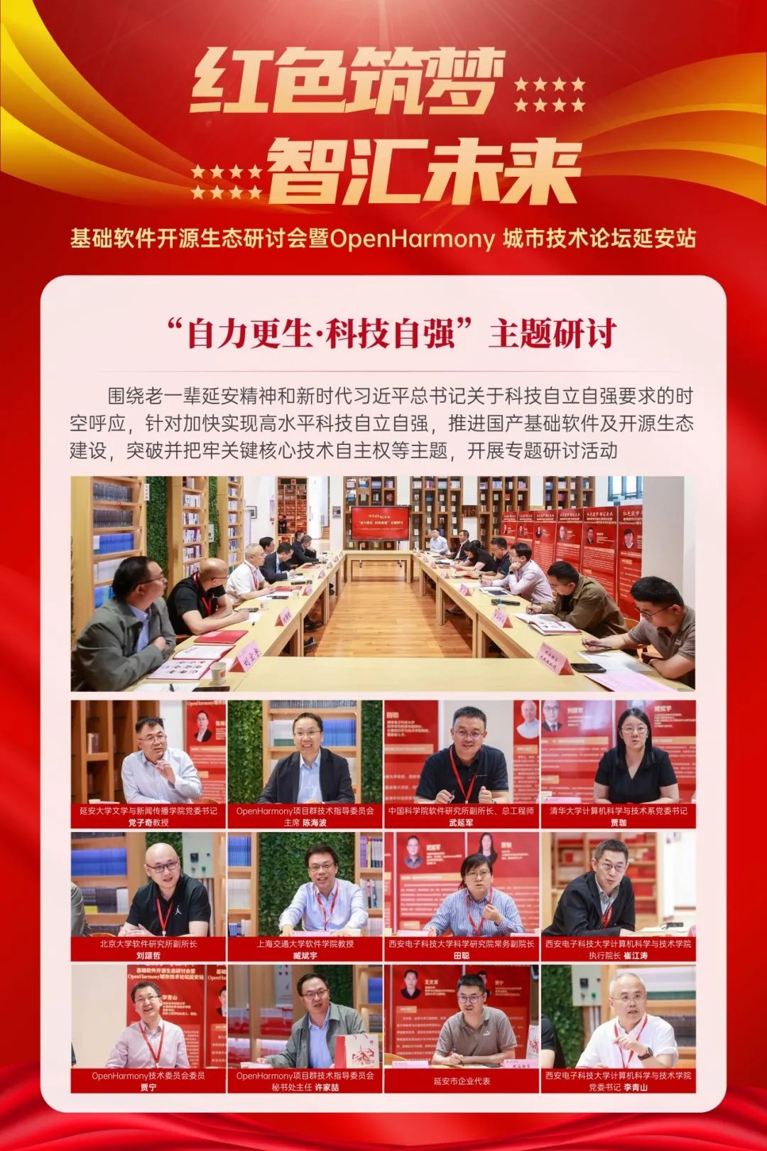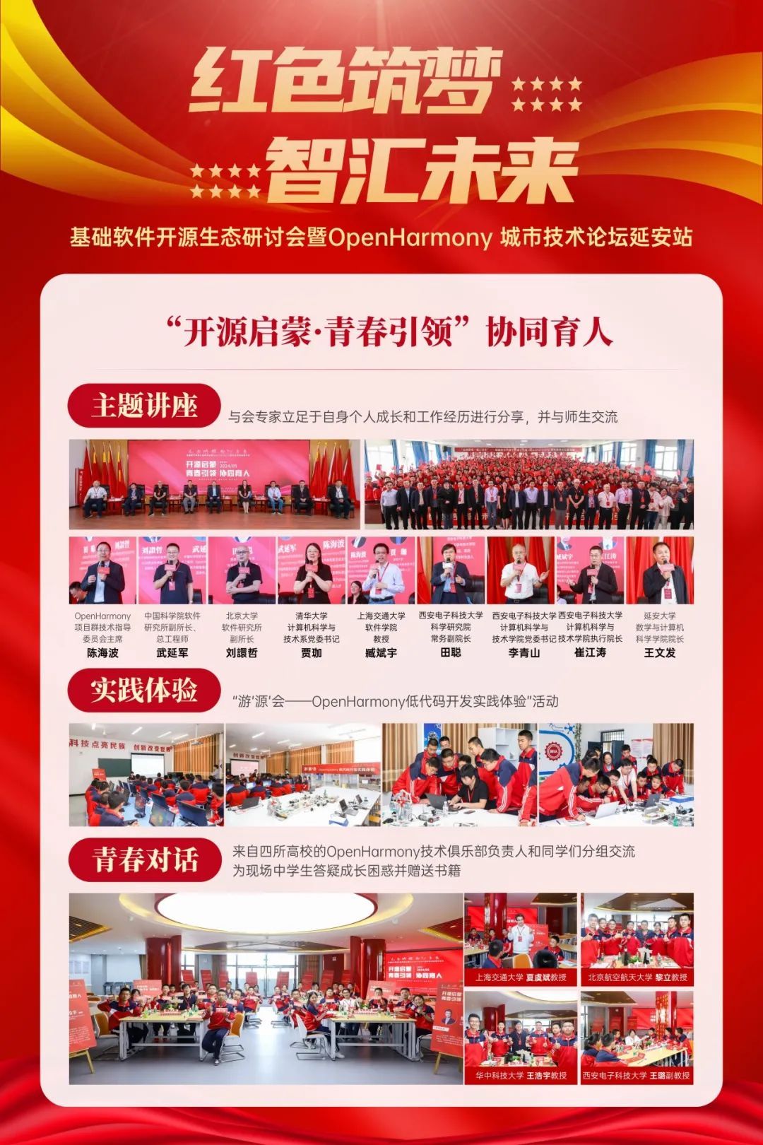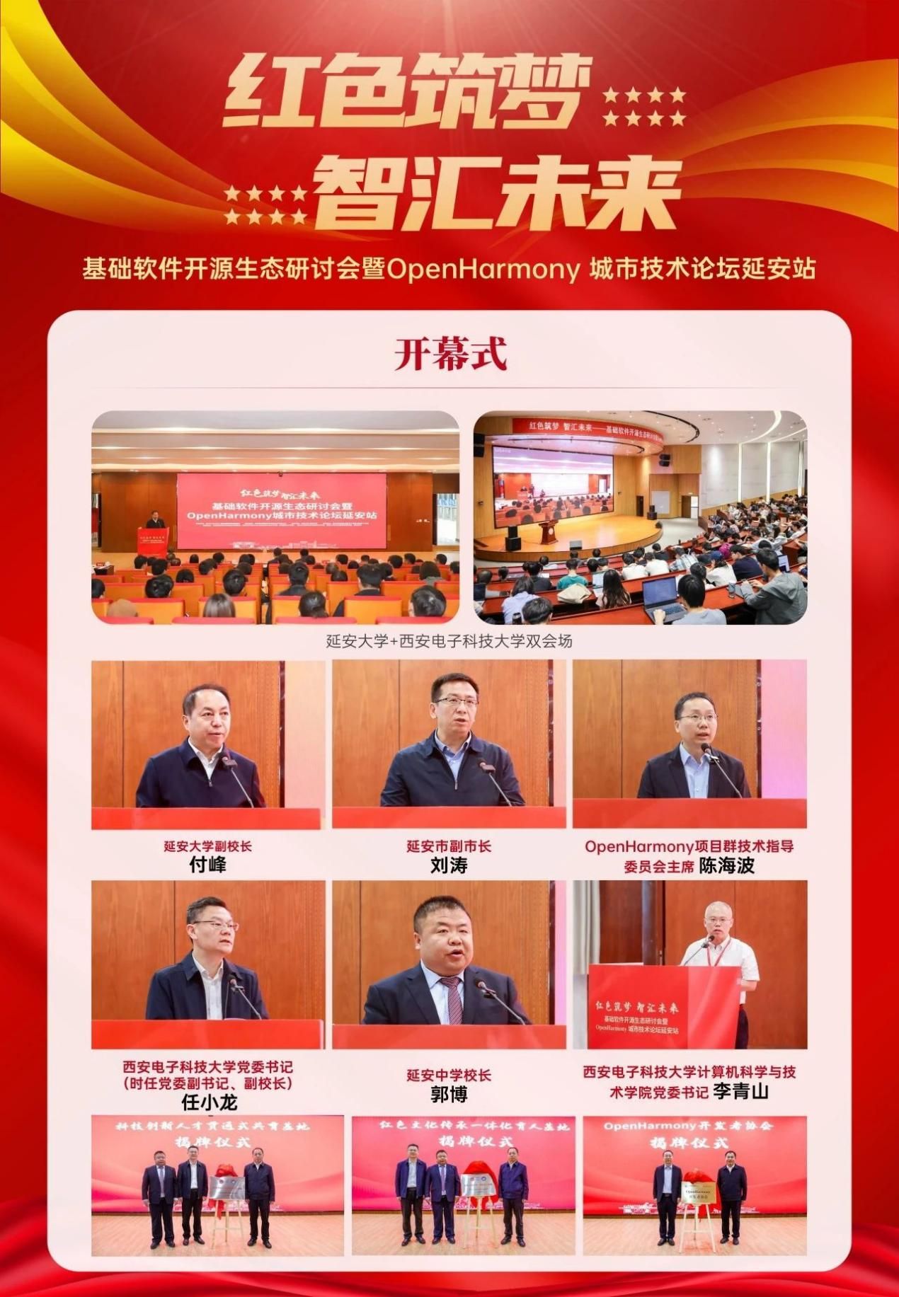 获得2024年“OpenHarmony技术俱乐部星光活动”奖项的“红色筑梦·智汇未来”基础软件开源生态研讨会暨OpenHarmony城市技术论坛延安站,由西电bat365在线中国登录入口前期精心筹划和组织,为深入贯彻落实习近平总书记在中共中央政治局就加强基础研究进行第三次学习时的重要讲话精神,“要打好科技仪器设备、操作系统和基础软件国产化攻坚战”的重要部署,活动由西安和延安两地联动,bat365在线中国登录入口、延安大学、延安中学、学习书院四会场协同,邀请了二十余名来自OpenHarmony项目群技术指导委员会、华为、中国科学院软件研究所、清华大学、北京大学、上海交通大学、北京航空航天大学、华中科技大学、bat365在线中国登录入口等在基础软件和开源领域有代表性和影响力的学术界和产业界专家学者受邀参加活动,延安市副市长刘涛、bat365在线中国登录入口党委书记(时任党委副书记、副校长)任小龙、延安大学副校长付峰、延安中学校长郭博出席,千余名大中学师生参加线下多场活动,数万人线上聆听技术报告。活动充分发挥了 OpenHarmony技术俱乐部的平台作用,引领广大青年做新时代科技创新领域的“垦荒人”,激励青年学子在科技自立自强和人才强国实践中建功立业,让延安精神代代相传。