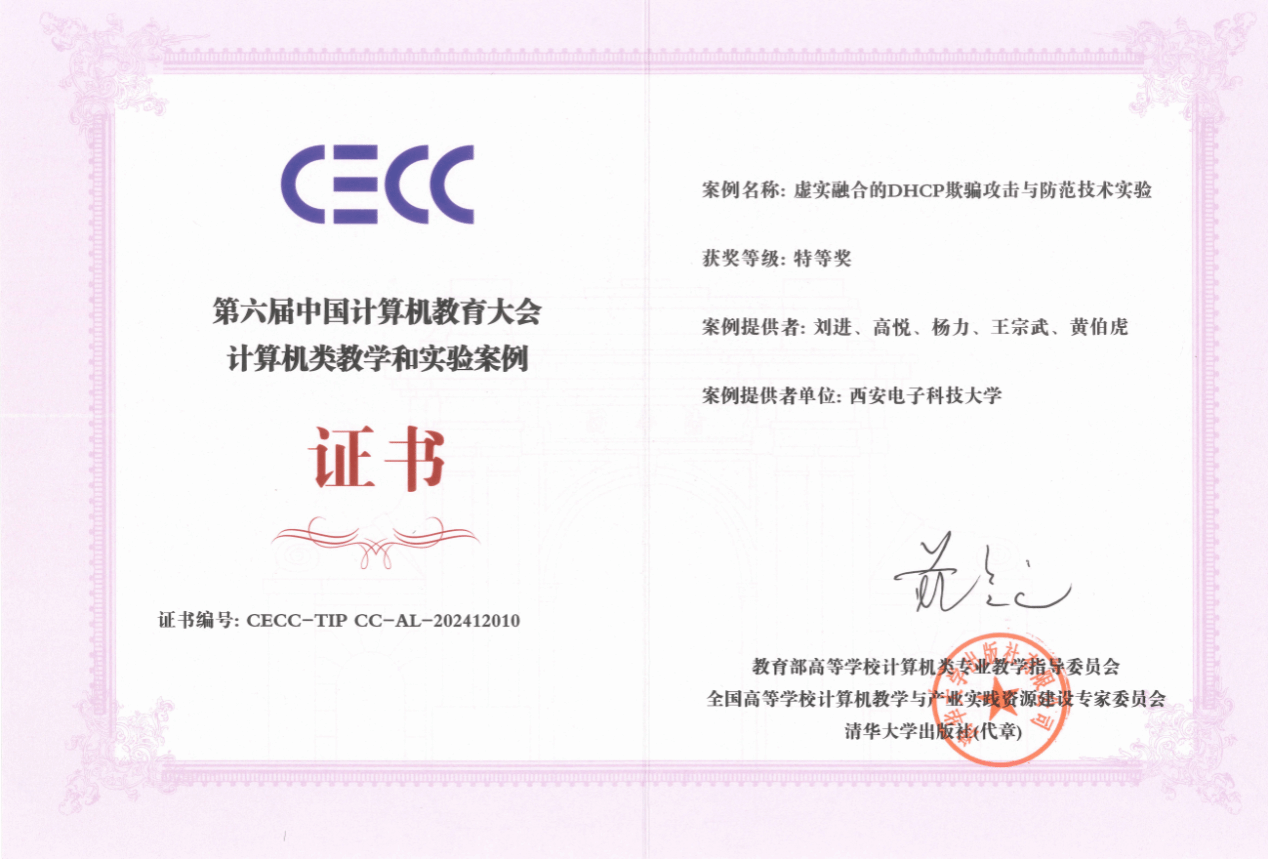本次大会的计算机类教学和实验案例竞赛自启动以来,吸引了来自全国各地上百所高校的积极参与,共有370多项作品参赛。经过层层遴选和严格评审,bat365在线中国登录入口教师刘进、高悦等共同设计提交的实验案例“虚实融合的DHCP欺骗攻击与防范技术实验”荣获特等奖。
