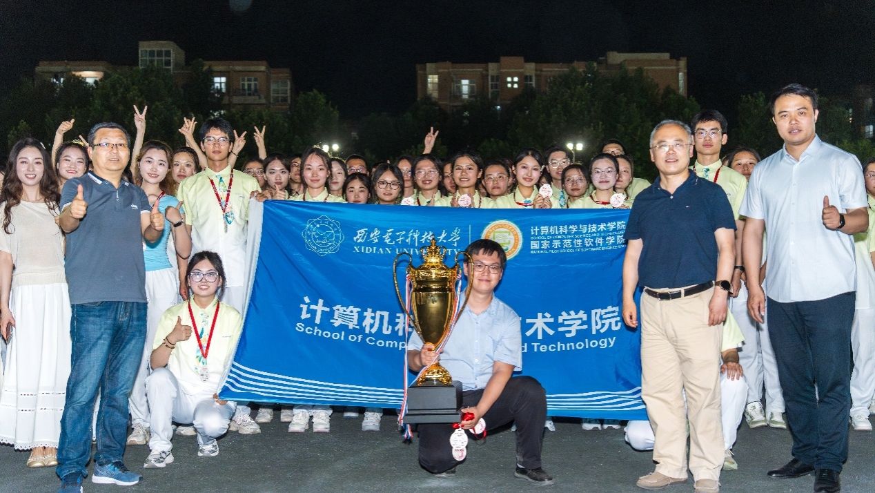 随着《本草纲目》动感旋律响起,150名计科学子如浪潮般涌入舞台,白绿交织的衣袂翻卷,恰似代码世界里跃动的光标,瞬间点燃全场气氛。音乐流转间,队列如数据流般快速重组,巨型表盘、数字城墙、科技烽火台、二进制时钟等富有学科特色的造型次第呈现,将科技理性与艺术感性熔铸成一场视觉盛宴。在“波浪式”队形变换过程中,计科学子整齐划一的蹲起动作是对西电红色电波的时代转译和继承传扬,刚健有力的挥臂姿态更是对 “挺膺担当” 青春誓言最生动的诠释与呼应。当音乐达到高潮,队员们齐声高呼“嘿!”,以蓬勃向上的姿态展示定格动作,掌声与喝彩声不绝于耳。比赛尾声,学院领导亲自为所有参赛同学逐一颁发奖牌及证书,并与同学们合影留念,将这份荣誉与喜悦永久珍藏。