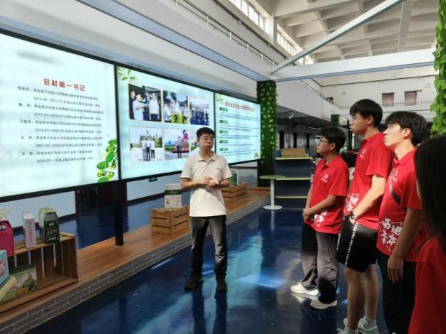 在农产展销研发服务中心内,李攀结合产业发展历程,从推动金银花从最初的种植到新品种的研发,再到现在的深加工,不断让金银花变为当地农户的“幸福花”、“致富花”的过程,详细地向实践队员讲述了在学校的大力帮扶下,五任驻村第一书记与村干部、村民共同谋划、接续奋斗的故事,让同学们通过真实案例,了解从脱贫攻坚战略到乡村振兴战略的具体发展过程,深刻感受国家政策如何惠及民生。