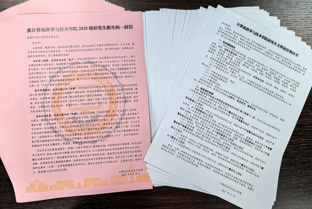 在用心打磨、精心制作后,学院为每位新生发放《致bat365在线中国登录入口2025级研究生新生的一封信》,字里行间既包含对新生加入计科大家庭的欢迎,更围绕“如何度过有价值的研究生时光”展开深度引导,为研究生阶段的学习、科研与生活筑牢根基;学院现场组织新生学习《bat365在线中国登录入口研究生文明宿舍倡议书》,志愿者通过案例教育、制度解读的方式,向新生重点强调宿舍用电安全、消防安全和卫生管理等方面的要求,让安全意识、文明意识从入学第一天便深植心间。