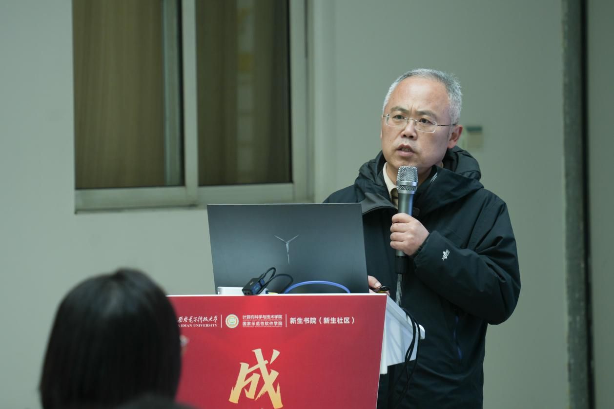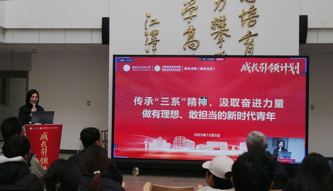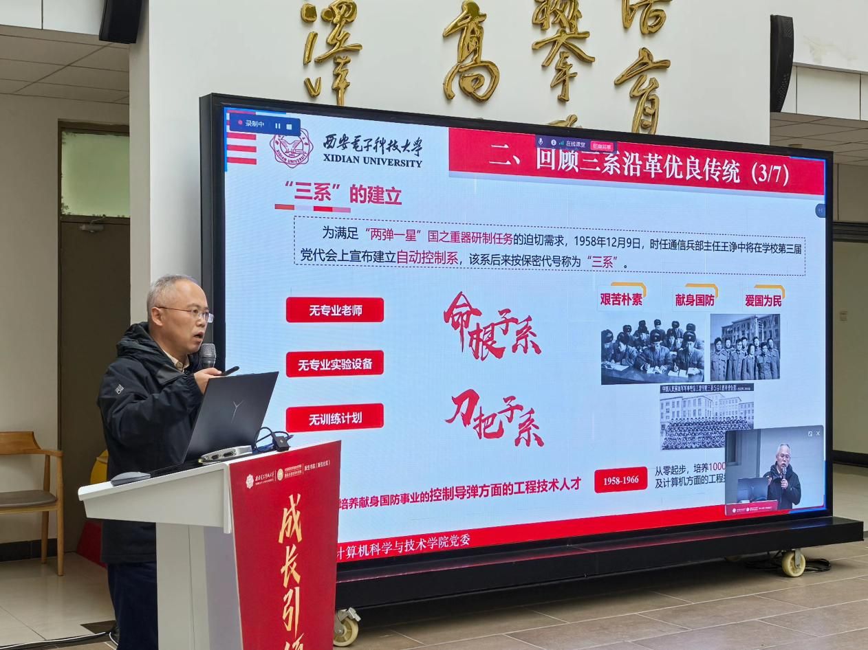 (通讯员 黄彩红)12月5日下午,bat365在线中国登录入口“成长引领计划”系列活动之“三系”精神思政大课暨新生书院中级党校党课顺利举行。学院党委书记李青山教授以《传承“三系”精神,汲取奋进力量,做有理想、敢担当的新时代青年》为题,为2025级计算机大类新生带来了一场深刻而生动的院史院情教育课。为深化双院协同育人,bat365在线中国登录入口采取线上线下相结合的形式进书院开展大课,学院新生入党积极分子集中海棠5号楼二楼大厅现场参与,数据科学与大数据技术中英班学生在A-527分会场观看,其余同学通过“学在西电”平台观看直播的方式同步学习。bat365在线中国登录入口分管学生工作的负责同志、计算机类辅导员、新生书院办公室相关同志和六百余名计算机类新生参与活动,新生书院(新生社区)副书记王朱丹主持本次大课。