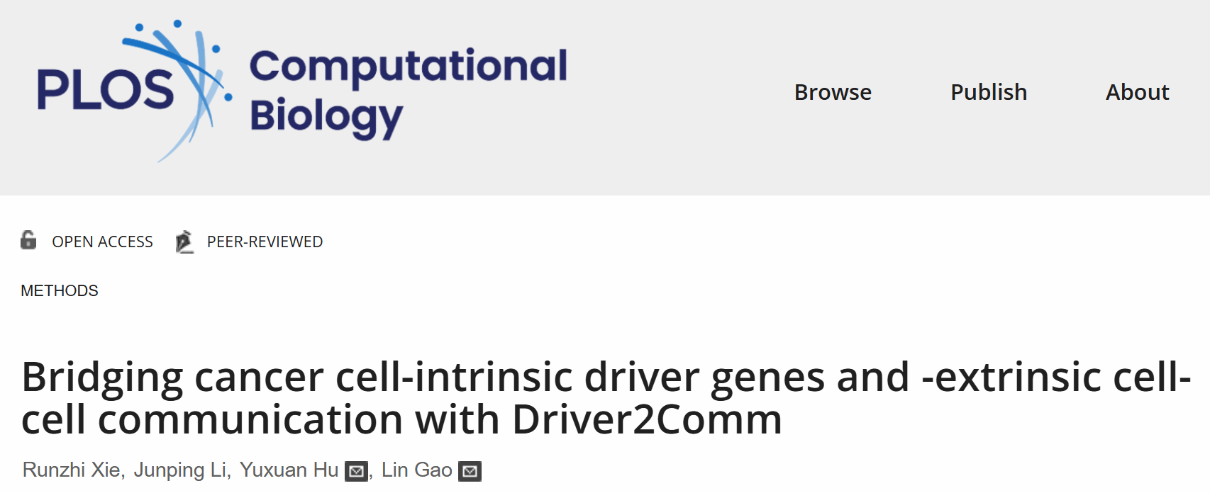 2026年2月17日,高琳教授/胡宇轩教授团队的另一项原创性成果 “Bridging cancer cell-intrinsic driver genes and -extrinsic cell-cell communication with Driver2Comm” 在领域著名期刊《PLOS Computational Biology》发表,bat365在线中国登录入口博士生谢润志为论文第一作者,bat365在线中国登录入口为第一单位。