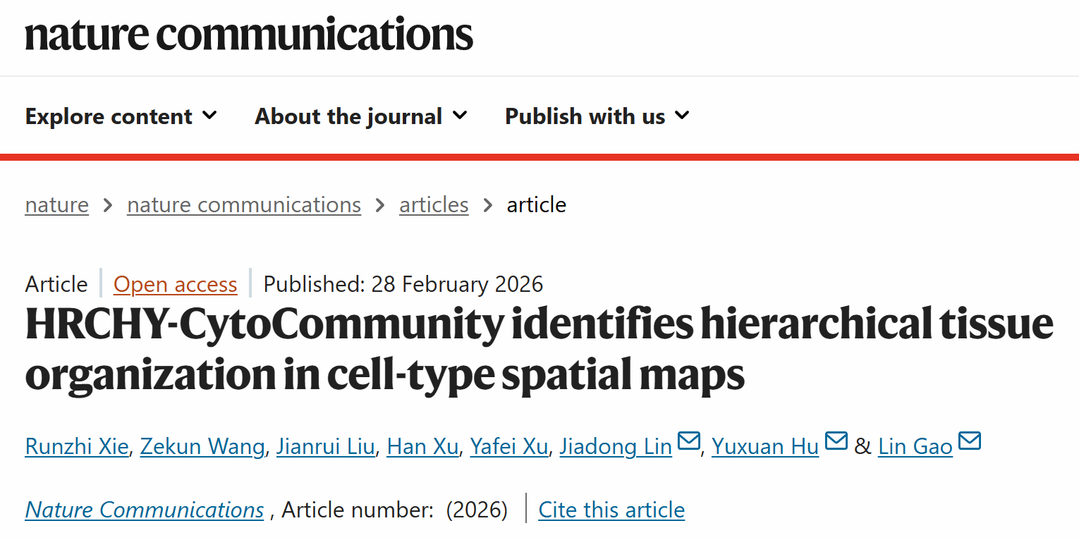 2026年2月28日,《Nature Communications》发表题为“HRCHY-CytoCommunity identifies hierarchical tissue organization in cell-type spatial maps”的研究论文。bat365在线中国登录入口博士生谢润志,硕士王泽坤为论文共同第一作者,bat365在线中国登录入口为第一单位。