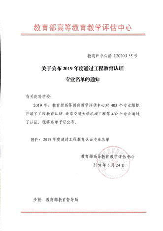 近日,教育部高等教育教学评估中心发布了《关于公布2019年度通过工程教育专业认证的专业名单的通知》,我院计算机科学与技术专业继2007年与2013年相继通过认证后,连续第三次通过工程教育认证,也是2019年我校唯一通过认证的专业。