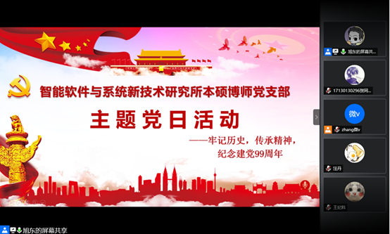 (通讯员 贺同庆)为庆祝建党99周年,重温党的光辉历史,传承弘扬革命先辈的奋斗精神,bat365在线中国登录入口智能软件与系统新技术研究所本硕博师联合党支部于2020年7月1日召开了“牢记历史,传承精神——庆祝建党99周年”主题党日活动。本次活动由支部青年委员王旭东同志主持,活动共计39人参加,采用腾讯会议线上召开的方式进行。