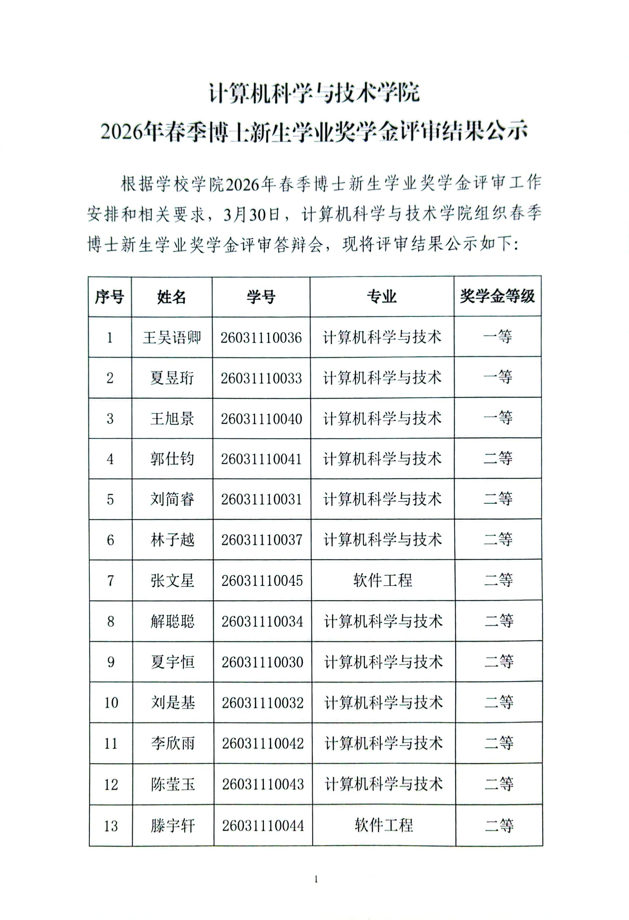 bat365在线中国登录入口2026年春季博士新生学业奖学金评审结果公示