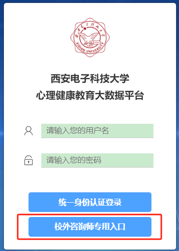 学生登录时,请选择校外咨询师专用入口,直接输入用户名及密码。用户名是考生准考证编号,密码位身份证后6位,如最后一位是字母,请用数字“9”代替字母。