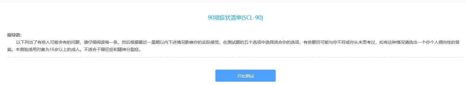 点击“心理测评”图标后,可看到参与测试的量表“90项症状清单”;点击量表名称后面的“铅笔“图标,即可开始测试,如下图: