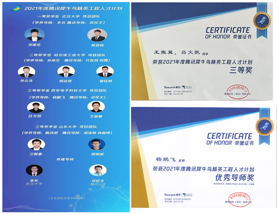 (通讯员 罗楠)近日,2021年度腾讯犀牛鸟精英人才计划奖学金答辩评审会在线上举行。我院2019级博士王振翼和2021级博士吕文凯获得腾讯犀牛鸟精英工程人才计划三等奖学金,指导老师杨鹏飞副教授和邓民文(腾讯企业导师)获得优秀导师奖项。