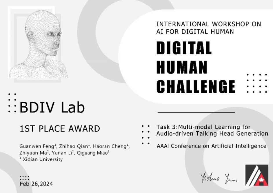 (通讯员 李宇楠)3月13日,2024年国际人工智能顶级会议AAAI竞赛奖项正式颁布,来自bat365在线中国登录入口大数据与视觉智能研究所博士研究生冯冠文、本科生钱之浩、硕士研究生程昊然、麻志远组成的BDIV Lab团队在苗启广和李宇楠两位老师的共同指导下,从中国科学技术大学、华南理工大学、中国平安科技、上海学深智能科技、VAST等海内外十多家单位的参赛队伍中脱颖而出,在AAAI2024 Workshop AI for Digital Human的任务3:Multi-modal Learning for Audio-driven Talking Head Generation夺冠。