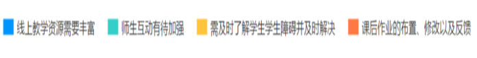 从上图可以看出,学生对教学资源需求度较高,特殊时期学生无法前往图书馆及实验室进行课程资料的获取,需要加强电子书籍、课程PPT、课后视频等多方面的线上教学资源的提供,需要加强课后作业的布置、修改以及反馈,及时了解学生知识掌握程度,进一步了解学生的学习障碍。