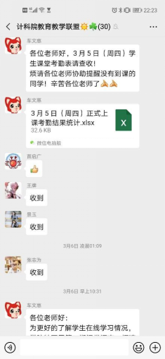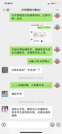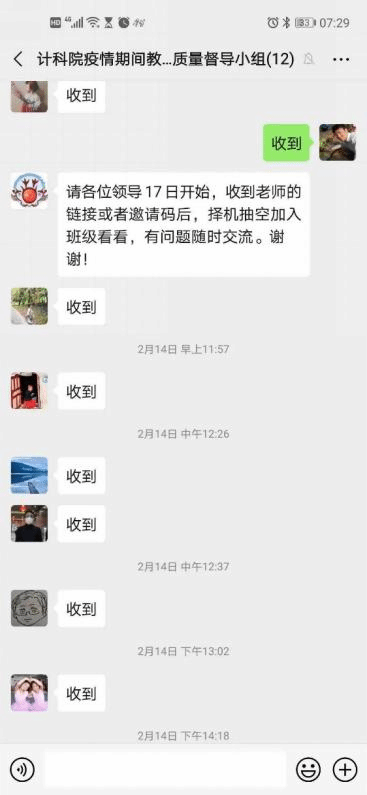 精细化管理,网格化督查。“学生需要,我们就去做好!”分管教学的副院长苗启广从“以学生为中心”出发,要求对线上教学和学生学习全过程进行精细化监控,成立了线上教学督导组,针对8个研究所的老师形成“网络化”督查模式。上课前,所有课程的链接、二维码、课堂暗号等由教务干事全部收集发到督查群。随时收集学生对教学质量的反馈意见,发现问题,解决问题,做好线上教学的自我监控和学生的舆论引导工作。