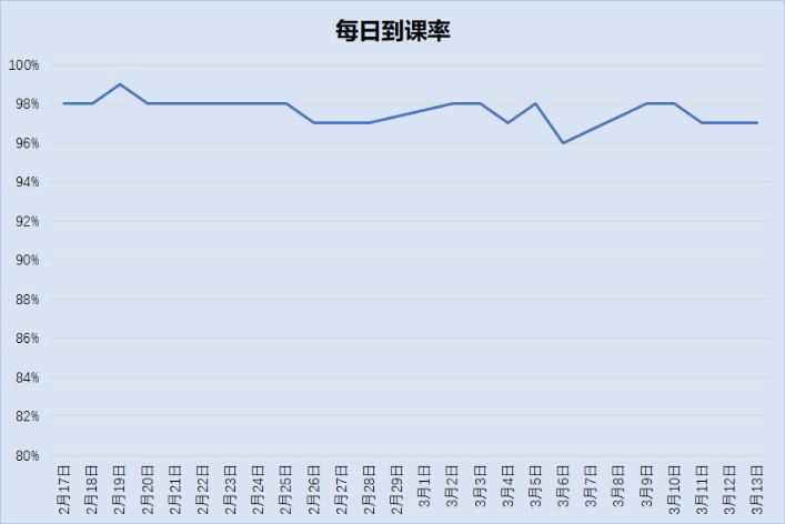 为确保学生按时上课,学院每天都会对40~50个班次的全部课程进行到课率统计。教务老师每天晚上统计汇总后,将到课情况反馈给辅导员,辅导员负责与缺课的学生联系交流,了解情况,分析问题,督促他们准时上课,努力做到“一个都不能少!”