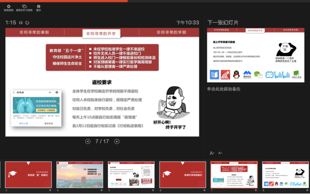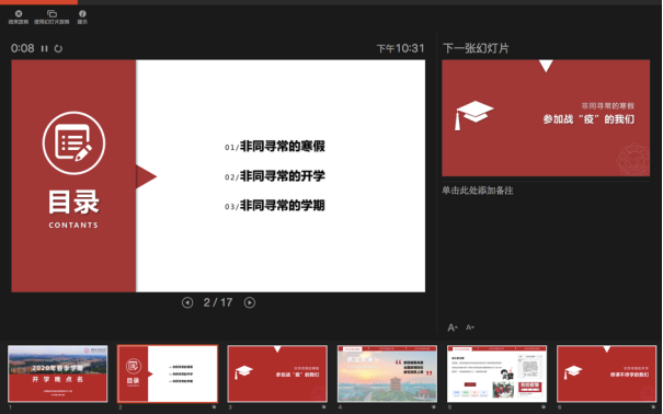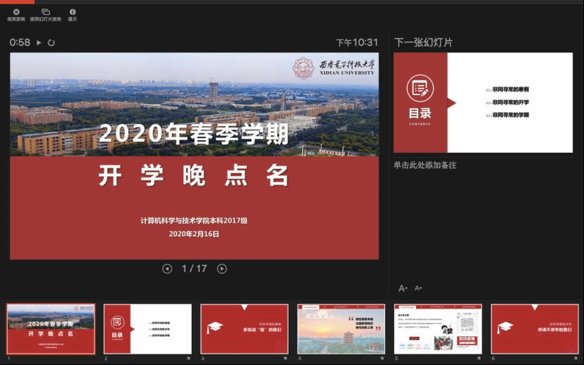 在这次班会上,辅导员以“非同寻常的寒假,非同寻常的开学,非同寻常的学期”展开,分析了当前疫情形势、带来的挑战和对大家的要求,特别为寒假期间同学们积极配合疫情防控工作,主动参与志愿服务,充分做好“延期不延学”各项准备点赞。导员老师以“最自信的中国人、最理性的西电人、最前沿的计科人、最期待的新青年”勉励大家,要求同学们坚决落实防控工作要求,调整个人状态,适应现阶段线上教学的节奏,为新学期明确目标、做好学涯规划,完成好学业任务。