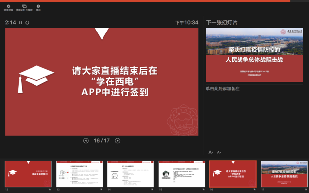 本科2017级辅导员张志为、研究生兼职辅导员黄彩红、辅导员助理王星予利用学校开发的“学在西电”线上教学app,直播了“晚点名”主题班会。因为首次尝试,尽管经过了数天的精心准备和测试,开始前他们还是非常忐忑。从晚8点开始,他们所负责的2017级计算机科学技术专业和物联网专业的500余名本科生分三拨召开了线上班会。看到直播顺畅,同学们基本都到齐了,在平台上跟导员老师活跃地互动,还有部分家长以访客身份观看直播,他们才放下心来,直呼“心血没有白费”。