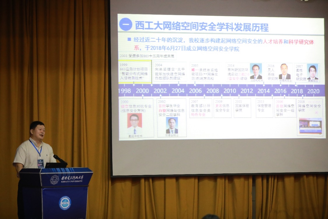 慕德俊教授介绍了西北工业大学网络空间学科,按时间顺序详细讲解了西北工业大学的网络空间安全学院的历史,并着重讲述了在科研方面的成就和项目成果。