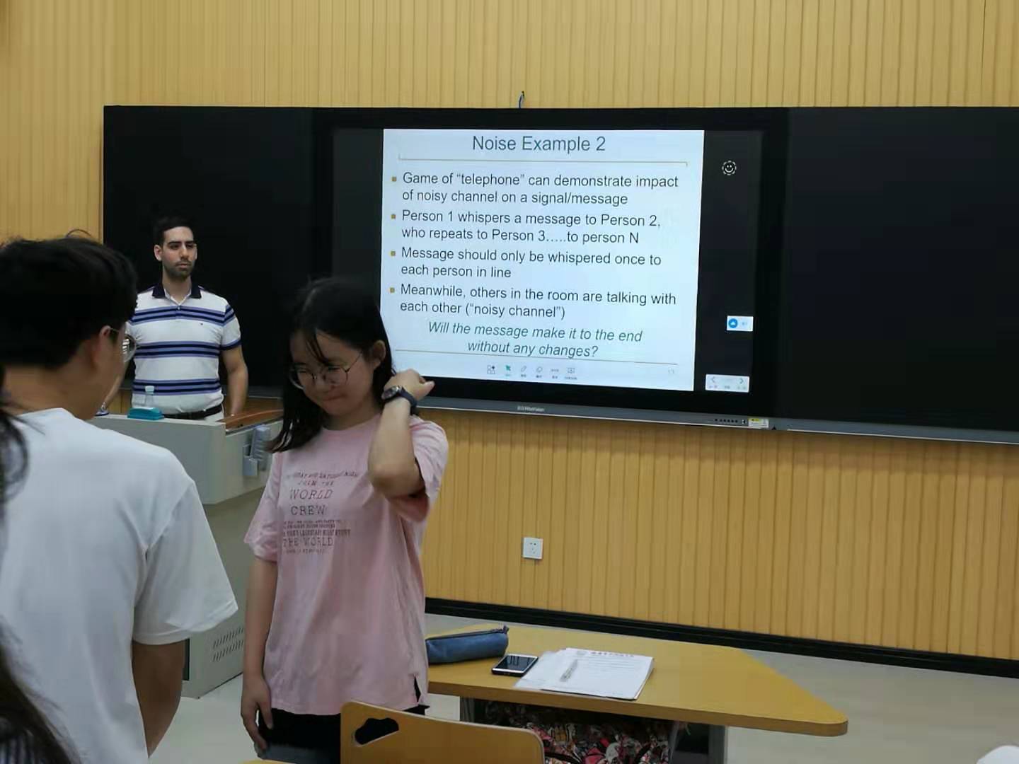 学生对这门课的兴趣很浓,原本只能容纳30人的智慧教室,吸引了很多前来旁听的学生,外教瞬间被学生的热情所感染,东西方思想的火花在这里开始碰撞。该课程使同学们最大感受是“自由,开放,参与,互动”。“国内”在教学方式上更多以老师讲授为主,学生处于被动地位,课堂氛围较沉闷,教学方式较单一。此次,外教则更多注重学生学习知识时的体验过程,课堂上更多采用分组探讨,活动与游戏等方法传授知识。该门课程使人印象最深的是外教讲授“噪声对信息传输的影响”时和学生开展的一个游戏。在这个游戏中,外教首先低声细语地告诉第一个学生一条信息,接着第一个学生再低声细语地告诉第二个学生,……。整个过程中,其他学生大声地交流来干扰信息的传递,直到最后一个学生收到信息。结果发现最后一个学生收到的信息与外教初始传递的信息竟然有很大的出入。学生通过该游戏,全程参与到老师课堂教学活动中,这种形式的教学,形象,生动,学生对课堂内容理解深刻,从避免了教学的枯燥乏味,学生注意力容易分散等问题。