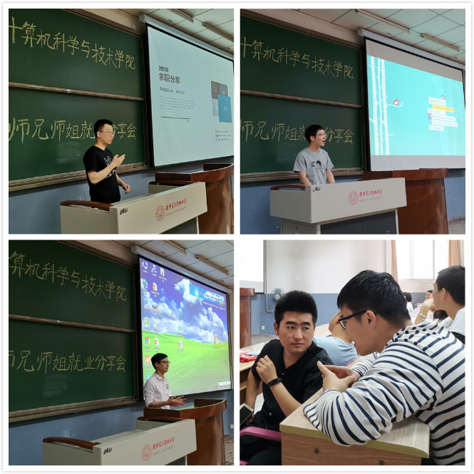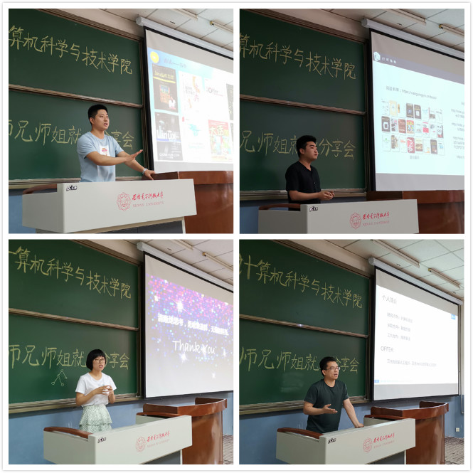 分享会上,研三学子主要对自身在求职过程中的心路历程进行了介绍,为师弟师妹们逐个“排雷”。其中,高伟光主要就个人求职历程、求职前的自我思考、校招信息时刻表、面试项目总结、推荐清单和面试感想等方面进行了详细介绍。王兴银主要就基础知识与面试技巧、简历制作与投递、offer抉择等方面讲述了自己的心得。田育珍主要就个人兴趣与企业岗位匹配、笔试面试关键注意点、产品思维与群面技巧、语言表达与面试复盘等常用的实用方法进行细致全面的总结和讲解。王志科主要就项目准备、科研与就业方向匹配、职前融入和地域环境等方面描述了自己的经历感受。付奥主要就算法题库、书籍推荐、工程经验、代码风格等方面为大家进行了梳理,并分享了自己创建维护的“推荐技术交流群”。黄晓堃主要就岗位介绍、知识积累与总结、面试经验和常用技巧等方面的“非传统操作”进行了概述。赵锦波主要就国企面试经验、Github和博客等干货资料进行了分享。