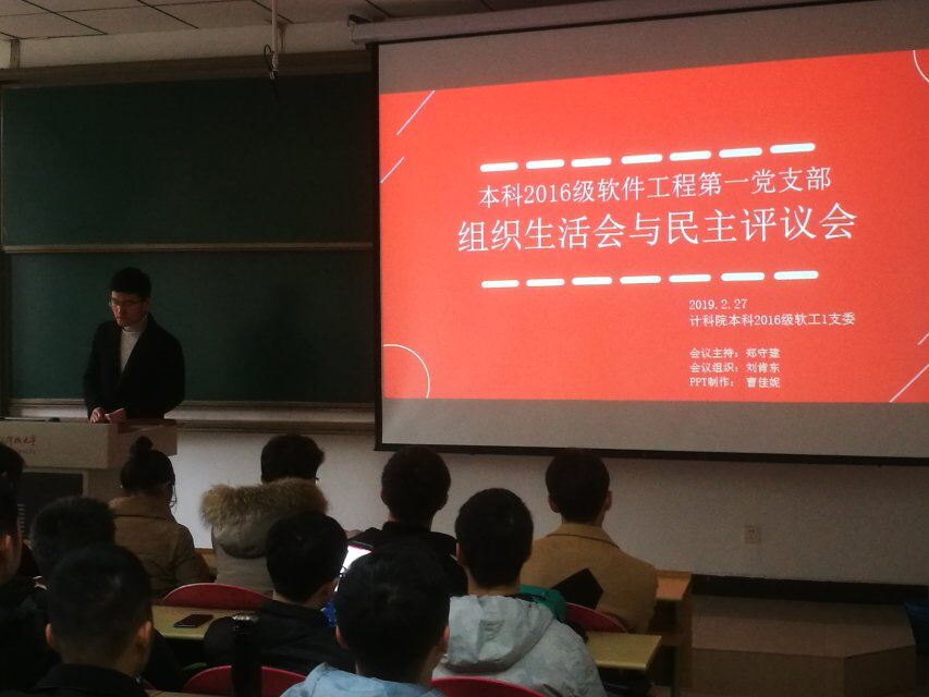 (通讯员 曹佳妮)为深入学习贯彻习近平新时代中国特色社会主义思想,严格执行党的组织生活制度,增强党内政治生活的政治性、时代性、原则性、战斗性,按照学校党委关于基层党支部组织生活会和开展民主评议党员工作的要求和部署,bat365在线中国登录入口本科2016级软件工程第一党支部于2019年2月27日下午在信远117教室,围绕学习贯彻习近平新时代中国特色社会主义思想,树牢“四个意识”,坚定“四个自信”,做到“两个维护”为主题召开支部党员组织生活会和开展党员民主测评。支部书记郑守建主持本次会议,全体正式党员和预备党员参加了会议。