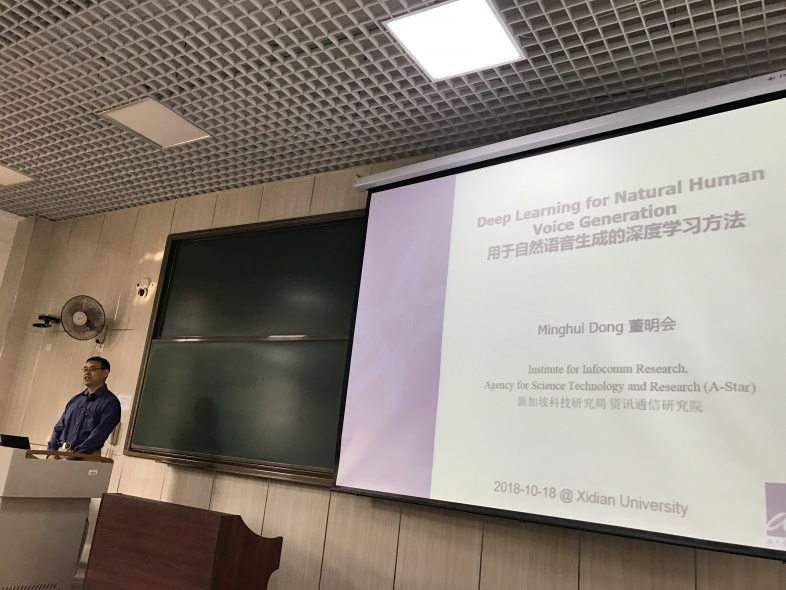 在李海洲教授作报告的同时,新加坡科技研究局资讯通信研究院的董明会博士,也做了“Deep Learning forNatural Human Voice Generation”的学术报告。