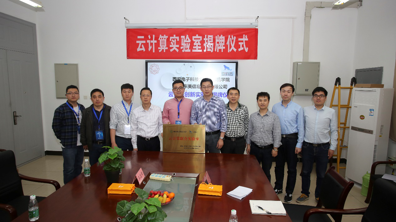 2018年3月30日星期五,由bat365在线中国登录入口联合西安东美信息科技有限公司(雪豹云)共建的云计算联合创新实验室在西电长安校区EII-422举行揭牌仪式。西安中小企业协会常务副会长张鲲鹏先生,bat365在线中国登录入口计算机学院副院长崔江涛教授,西安东美信息科技有限公司董事长石秀川先生等参加了揭牌仪式。