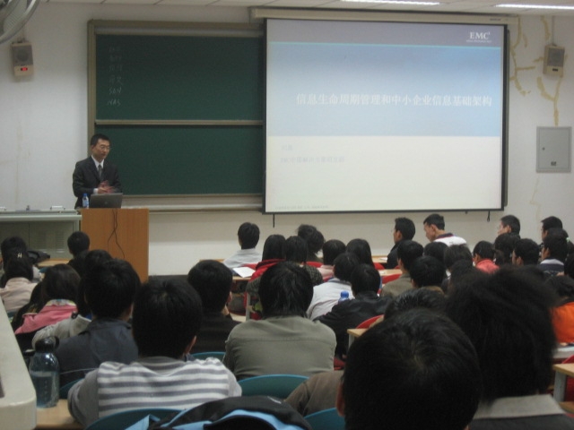 为配合《存储技术基础》课程的实施,于2007年11月13日19:00-21:00,在新校区信远楼2区117教室,我院邀请EMC公司刘磊工程师为计算机学院05级本科生作了《信息生命周期管理和中小企业信息基础架构》的技术讲座。刘磊工程师结合实际案例,说明了当前存储技术的发展情况。在整个讲座过程中,同学们表现出浓厚的兴趣并积极参与互动,现场气氛热烈,取得了良好的效果。
