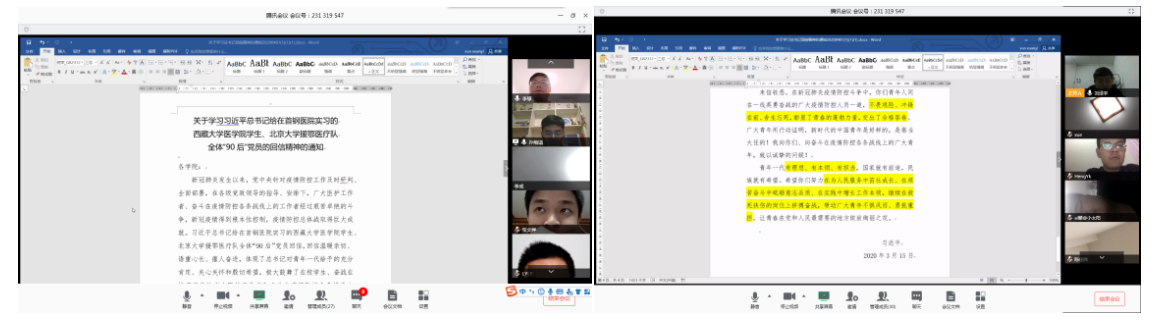 (通讯员 刘泽宇 孙煊溢)新冠肺炎疫情爆发以来,广大医护工作者、奋斗在疫情防控各条战线上的工作者披荆斩棘、勇挑重担,为坚持打赢疫情防控总体战不遗余力。3月15日,习近平总书记给在首钢医院实习的西藏大学医学院学生、北京大学援鄂医疗队全体“90后”党员回信,向他们和奋斗在疫情防控各条战线上的广大青年,致以诚挚的问候。回信在广大青年学生,特别是学生党员中引起热烈反响。4月3日晚上7点30分,bat365在线中国登录入口硕士031712班第一、二党支部通过线上会议方式举办了“青年不惧风雨、抗疫勇挑重担”主题党日活动,认真学习习近平总书记回信精神,并开展热烈讨论。