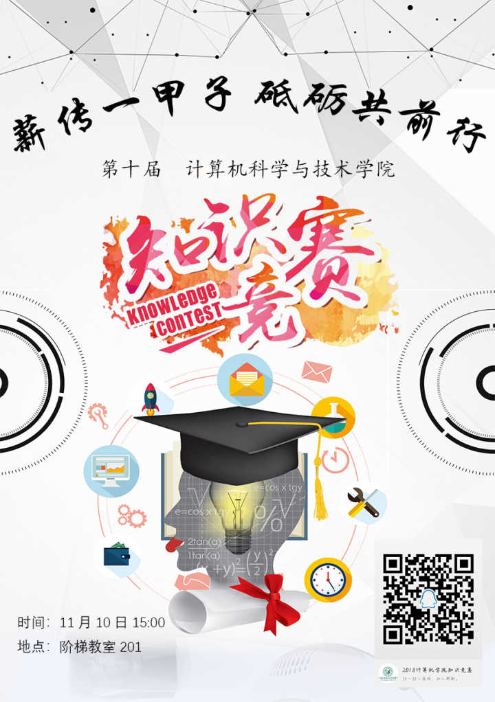 bat365在线中国登录入口第十届知识竞赛来啦!本届知识竞赛以“薪传一甲子,砥砺共前行”为主题,旨在纪念我校迁校60周年,增加大家对我校校史及专业知识的了解,丰富研究生的课外活动,为大家创造一个更广阔的平台,同时使大家能够在比赛中收获快乐,收获友谊。此次知识竞赛题型多样,内容丰富,不仅有时事政治,西电历史,同时还有各种类型的百科知识,总有你可以发挥的地方。除此之外,本次知识竞赛还设有丰富的奖品及获奖证书,乐扣保温杯,闪迪U盘,卡通抱枕,各种各样的小玩偶,参与即有奖,只要你来我们就让你不虚此行。11月10日下午三点阶梯教室J201,记得带上你的室友,基友,或者那个他/她,3-5人一组,让我们一起来场头脑风暴吧!大家不见不散哦~更多详细信息,请加入计算机学院知识竞赛QQ群,群聊号码:924146808