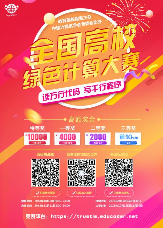 各位同学、老师,由教育部高等学校计算机类专业教学指导委员会、教育部高等学校软件工程专业教学指导委员会、全国高等学校计算机教育研究会、绿色计算产业联盟(GCC)共同举办的第一届全国高校绿色计算大赛开始啦~!