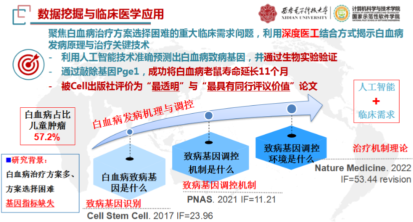 在医疗大数据挖掘与应用方面,马小科教授长期从事医学大数据挖掘与分析,为临床医师的精准诊断、合理治疗方案制订提供帮助。白血病是导致人类死亡的主要疾病之一,研究其发病原理具有重要的意义。通过与美国爱荷华大学医学院进行医工合作,利用数据挖掘与机器学习方法分析白血病患者的深度测序数据,成功发现PGE1基因有效抑制人类骨髓干细胞活性与自动修复功能,为慢性白血病的早期确诊与有效治疗提供了新的思路。同时,进一步利用单细胞测序数据探索白血病恶化组织细胞分化过程的调控关系,证实了Tcf1异质B细胞分化功能。这些研究成果为白血病治疗与诊断提供了理论基础。