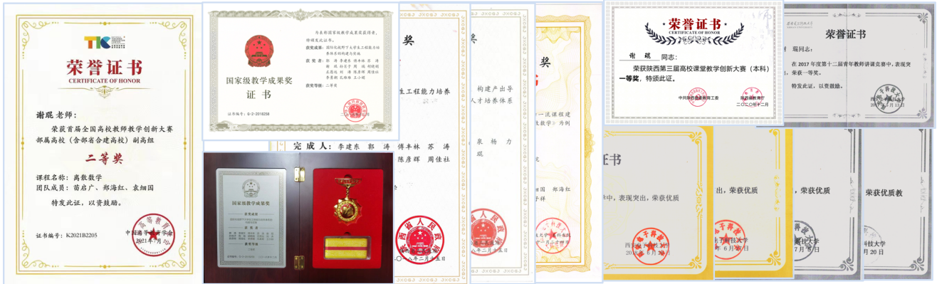 矢志创新,推动教改。在长期的一线教学工作中,谢琨同志积累了大量的经验,进行了深入的人才培养和本科教学工作的探索与实践。近五年主持教育部、省校级教改项目12项,其中省级重点项目4项,作为主要完成人参与教学改革项目8项;在CSSCI、中文核心等期刊发表教改论文9篇。作为课程负责人获首批陕西省线下一流课程1门,2021年被推荐国家级线下一流课程评选(在评)。经过长期的探索实践,教学改革成绩显著:获首届全国高校教师教学创新大赛二等奖(西电唯一),国家级教学成果奖二等奖,陕西省教学成果特等奖、一等奖、二等奖各1项,陕西省高校课堂教学创新大赛一等奖,第三届全国“互联网+”大学生创新创业大赛优秀导师奖和首届全国“互联网+”大学生创新创业大赛陕西赛区优秀导师奖,陕西省高校教师微课教学比赛三等奖,bat365在线中国登录入口第十二届讲课竞赛一等奖,bat365在线中国登录入口优秀教学质量奖一等奖等校级以上教学奖项近30项。