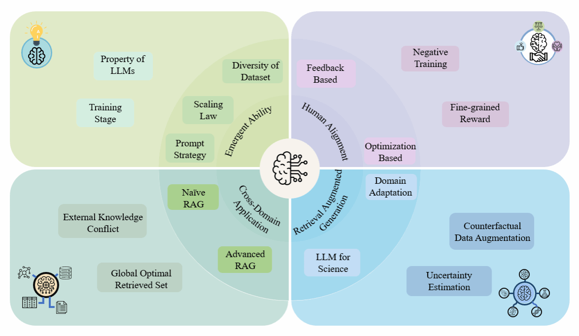 论文围绕LLM发展的四大关键主题进行了系统性阐述,包括:1)涌现能力:探讨LLM规模增长引发的非线性能力跃迁,以及如何基于更细粒度的分析方法来揭示 LLM的能力跃迁本质;2)人类偏好对齐:探讨了如何通过负样本学习、反事实数据增强等方法减少标注依赖,提升LLM在复杂偏好环境下的适应性;3)检索增强生成(RAG):探讨了如何通过优化检索策略、提升知识整合能力、缓解外部知识冲突,使 RAG技术在医学、法律、科学研究等领域发挥更大作用;4)DeepSeek与跨域应用:探讨了LLM未来可能的发展方向,如基于因果推理的模型优化和不确定性估计等方法,以提升LLM在不同学科中的泛化能力。DeepSeek在优化LLM计算效率、减少推理成本、增强可解释性方面取得了重大进展,这些创新为LLM未来的发展和跨域应用提供了新的思路,使其更加高效可控,并能够在计算资源受限的环境中依然保持卓越的推理能力。