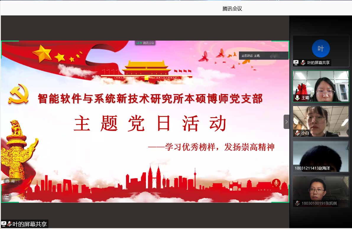 (通讯员 张凯琪)为了深入贯彻习近平总书记关于学习老一辈工作楷模、传承“五老”精神的重要指示,学习和发扬老一辈优秀榜样的崇高精神,bat365在线中国登录入口智能软件与系统新技术研究所本硕博师联合党支部于2020年11月27日下午开展了“学习优秀榜样,发扬崇高精神”主题党日活动。活动由支部青年委员叶国强同志主持,共计47人参加,采用腾讯会议线上召开的方式进行。