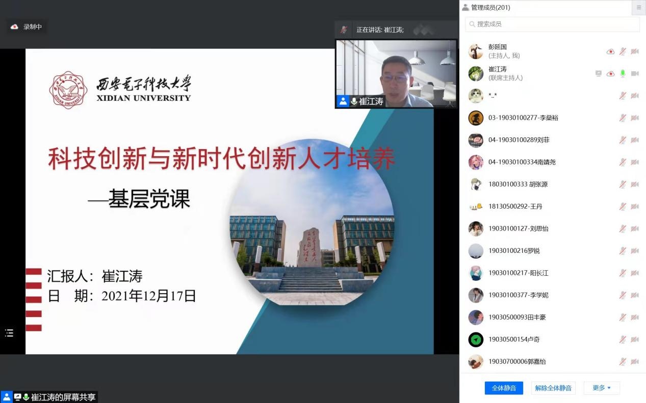 (通讯员 彭延国 尹雪妍)2021年12月17日下午,学院执行院长崔江涛教授为智能媒体与数据工程研究所本硕博师第一、第二和第三联合党支部师生讲授《科技创新与新时代创新人才培养》专题党课。活动由第一联合党支部彭延国主持,联合支部全体党员、积极分子和研究所200余位研究生同学参加。