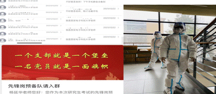 在得知学校研考工作需要大量志愿者后,支部书记杨延华报名党员先锋岗预备队,迅速投入我校考点考生信息摸排工作,紧急与联络单上的考生一对一电话联系,询问相关情况,督促他们尽快填写考生情况摸排问卷,并与电话联系不上的考生短信联系,确保不漏一人。她在研考期间承担了学校为封控区考生专设的隔离专班的考务工作。