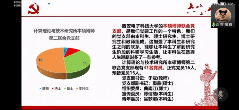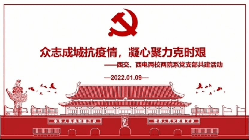 然后,西电的甘瑜嘉和西交的佘晓亮分别介绍了两校两院系党支部的抗疫工作情况。西安疫情当前,各高校均采取了严格有效的措施,西电bat365在线中国登录入口计算理论与技术研究所本硕博师第二联合党支部迅速响应学校和学院党委号召,多名支部党员、入党积极分子加入学院志愿队,担任核酸检测志愿者、出入证志愿者等,以实际行动为同学们服务。西交南洋书院师生联合第三党支部快速响应,迅速发布了有关疫情防控的倡议书,组建书院抗疫志愿先锋队,组织“出入证志愿者、食堂志愿者、核酸检测志愿者”志愿服务队,学院老师、辅导员坚守一线,积极参与,为疫情防控做出贡献!