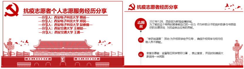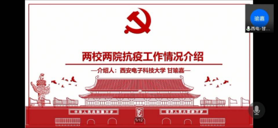 最后,双方党支部学生代表分享了抗疫志愿服务经历。西电的曾诚作为核酸检测医生助手,从一个旁观者的角度描述了核酸检测人员的不易,动情于他们的奉献也更加使人们热爱这片土地和在此生活的无数可爱的人们;西电的郑昊和彭雅倩也分享了自己作为抗疫物资搬运志愿者的收获和感悟,更加认识到“奉献”是最大的幸福,全心全意为人民服务是中国共产党的根本宗旨。西交的王栩韬分享了作为核酸志愿者的工作经历,每天都要穿着层层的防护服,甚至连上厕所和喝水都受到限制,但同学们从不喊累,能够为同学们服务是最大的幸福;西交的王勇分享了拍照记录疫情期间志愿服务的经历,一帧帧的画面将疫情中的温情定格,苦难终将过去,但奉献和善意永不过时。