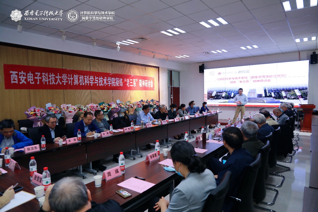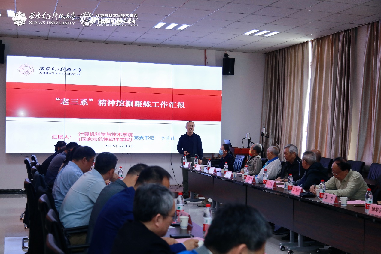 学院党委书记李青山详细汇报了前期“老三系”精神挖掘凝练情况。“老三系”是为满足“两弹一星”国之重器研制任务的迫切需求而建立,在艰难条件下创造了教学、科研、对外交流等方面的多项第一,为人才培养的西电现象做出了重要贡献。学院党委高度重视,以搬迁南校区为契机,将凝练“老三系”精神作为文化育人的重要举措,在分类调研中国精神与大学精神的凝练情况、系统梳理老三系历史沿革、挖掘整理“老三系”优良传统的基础上,提出了“老三系”精神凝练概括的初步思考。召开凝练“老三系”精神研讨会,旨在集思广益,凝心聚力传承“老三系”精神,促进学院事业发展。